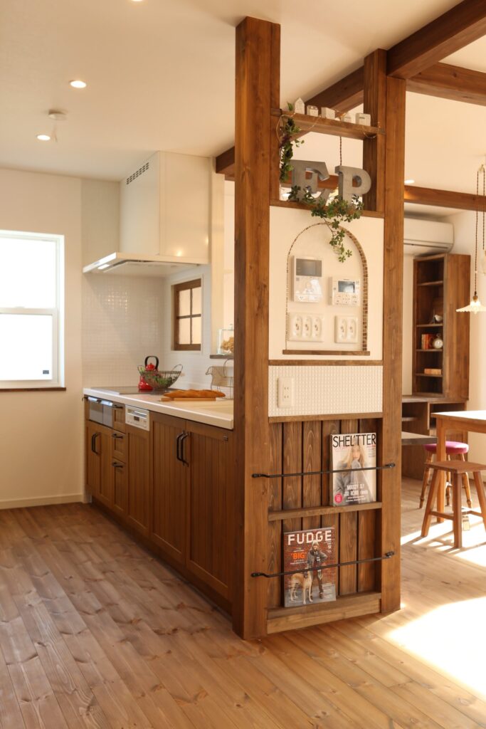 機能性だけでなく、注文住宅ならではの遊び心をプラス。埋め込み三面鏡ですっきりさせたタイル貼りの造作洗面台や、空間を柔らかく仕切るアールの引戸。キッチン横のマガジンラックなど、暮らしの質を上げる「大人可愛い」ディテールを散りばめました。