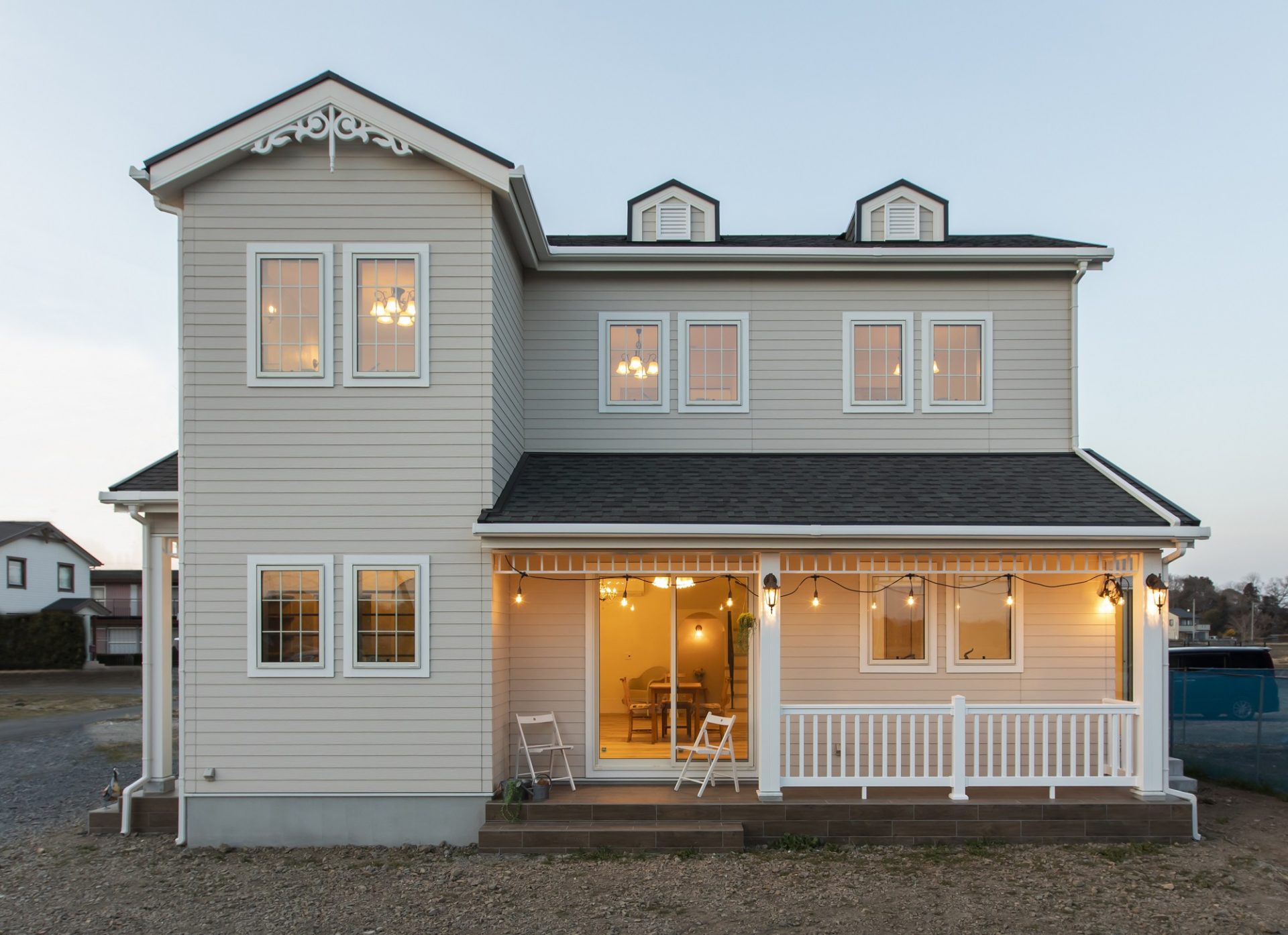 ホワイトの外壁にモールに格子の入っ窓に妻飾り、屋根にはドーマ―のある、華やかなカリフォルニアスタイルのお家です。