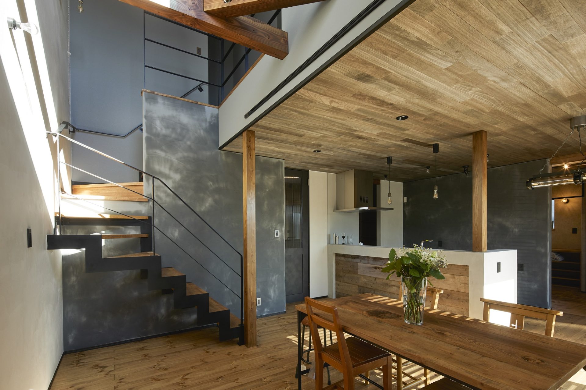 インテリアは、アイアンのイナズマ階段に始まり、足場板とモルタルのキッチン腰壁・天井はワールドマテリアルのボルドーグレージュを貼ったオーナーご夫妻のこだわりの詰まったお家です。