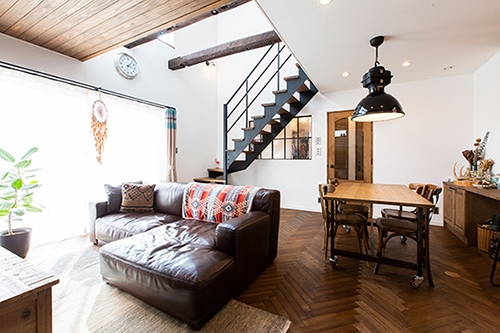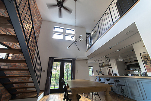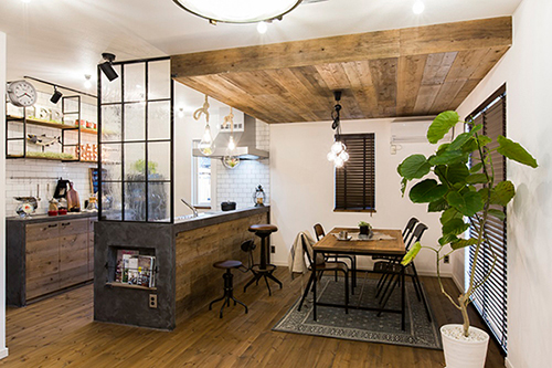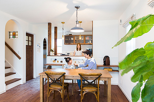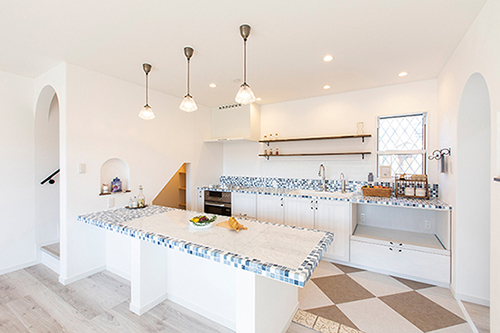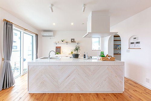 アイランドキッチンとリビングに面してテラスのある毎日が楽しくなる家
